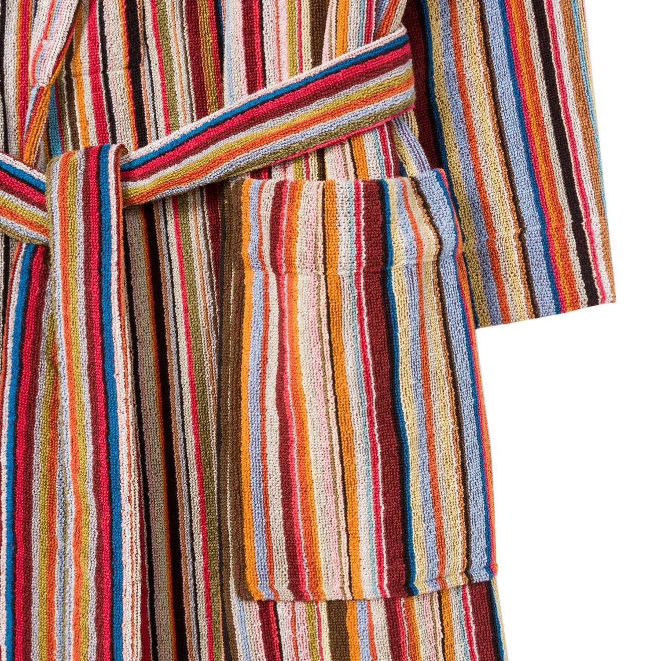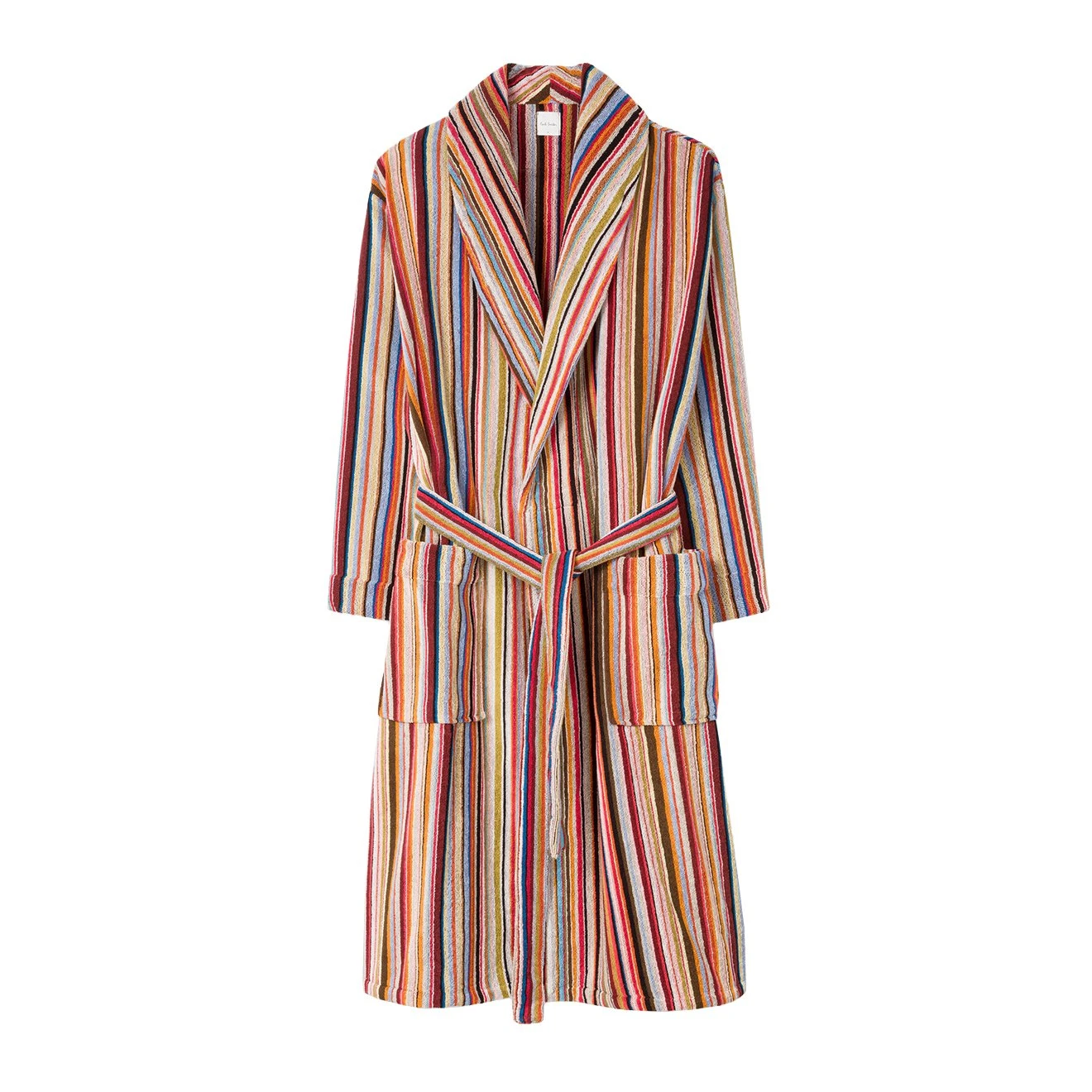 The Paul Smith Dressing Gown in Multi Stripe is crafted from 100% cotton towelling. Featuring two side pockets in the matching Paul Smith signature stripe design.